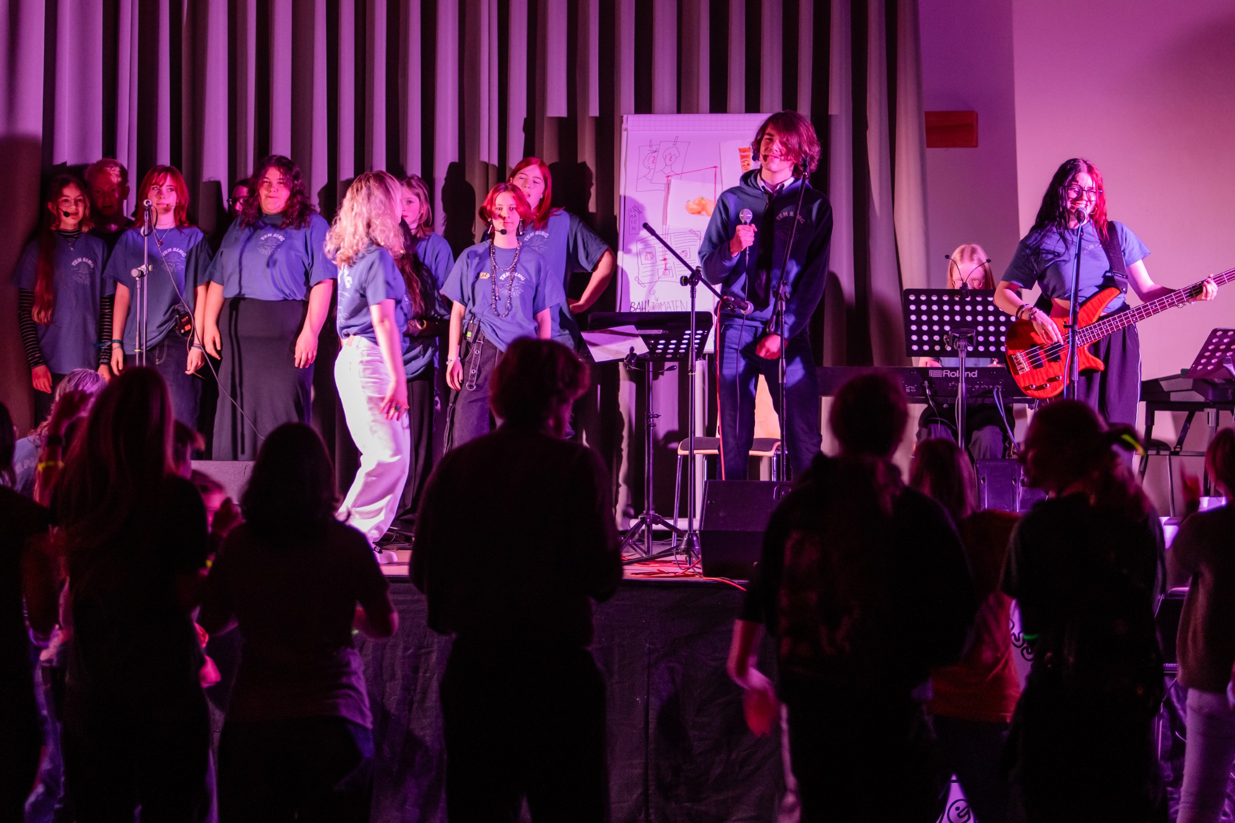 In der Vorbereitung war die Gruppe durch einige Tiefen gegangen, aus schulischen und privaten Gründen war es zu einigen schmerzlichen Verlusten beim Team der Workshopleiter:innen gekommen. Auch die Zahl der Teilnehmenden hat sich seit Anfang 2024 von zeitweise fast 35 (mit Orgateam) auf derzeit etwa 20 Personen reduziert. Umso erfreulicher ist es, dass die Gruppe es in der aktuellen Zusammensetzung geschafft hat ein beeindruckendes Konzert auf die Beine zu stellen. Vom Publikum, darunter Gäste aus den TEN-SING-Gruppen in Weimar und Eschwege (Hessen), gab es ein großes Lob für alle Workshops, von der Band bis zum Chor, für das Theaterstück und die Tanzgruppe.